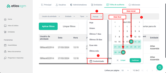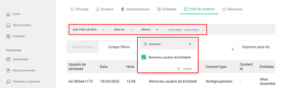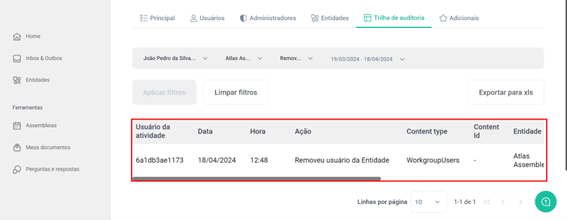 Caso eu deseje visualizar quantas remoções de usuário foram feitas pelo João Pedro, na entidade “Atlas Assembleias”, em um período de 1 mês, basta que eu realize este filtro: